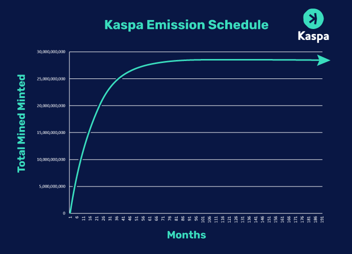 Kaspa is currently the fastest proof-of-work, mineable coin in existence while still remaining decentralized. The blockDAG architecture with rapid block rates allows more mining decentralization and enables effective solo-mining at lower hashrates. Fair-launched in November of 2021 with no pre-mine, zero pre-sales, and no coin allocations, Kaspa is 100% decentralized, open-source, and community managed. Total supply of Kaspa is 28.7 Billion coins with an emission schedule that halves once per year via smooth monthly reductions by a factor of (1/2)^(1/12).